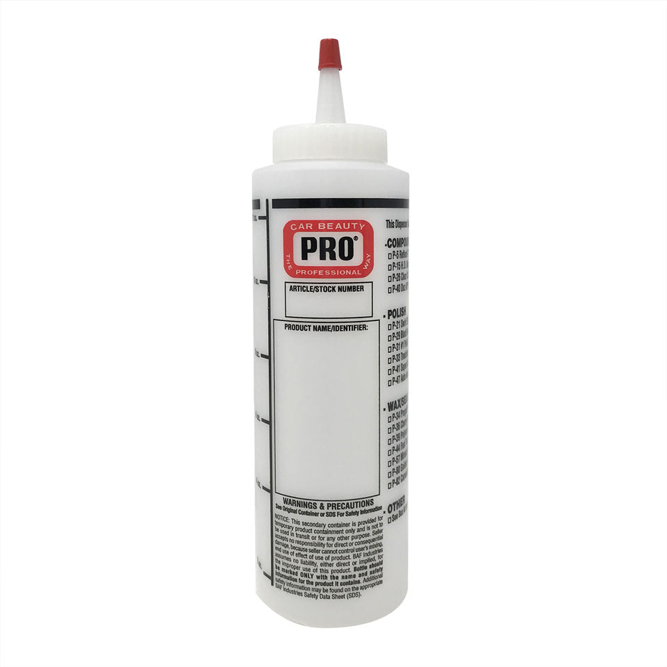 Polypropylene yorker spout cap with closure. .090 hole in spout. 38/400 neck fits B-31 polish bottle. Translucent w/red sealer cap attached.12 oz. handi-hold, round bottle. High density polyethylene (HDPE) with printed PRO® logo, GHS hazard pictogram/signal word check off. Area for product identifier/stock number. Oz./ml. scale. 38/400 neck. Translucent with red and black silkscreen. Precision tip yorker spout with closure. Great for use with all PRO® compounds, polishes, glazes, waxes, and sealants.